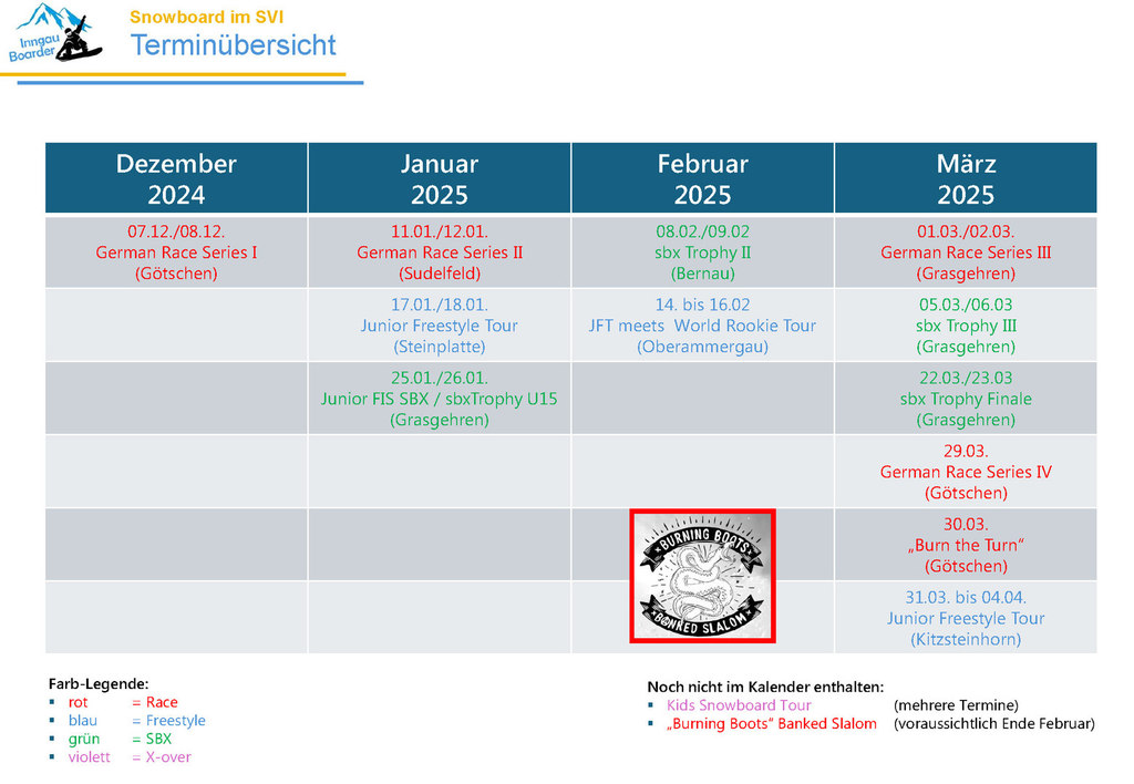 Am 22./23.02. findet am Spitzing der „Burning Boots“ Banked Slalom statt. Ein mega Wettkampf-Format , bei dem sich junge (und alte) Boarder in cooler Atmosphäre messen können. Hier passt die Stimmung und der Kurs – auch (und vor allem auch) für Einsteiger. Infos und Links findet ihr auf unserer SVI-Website.