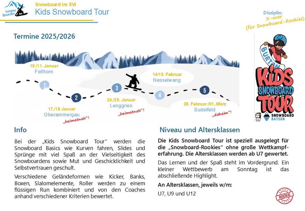 Die Kids Snowboard Tour ist speziell ausgelegt für die „Snowboard-Rookies“ ohne große Wettkampferfahrung. Die von Snowboard Bayern koordinierte „Kids Snowboard Tour“ richtet sich an alle jungen Boarder und auch Board-Einsteiger. Mit anderen Boardern zusammen ein Wochenende lang mit Profis trainieren und sich am Schluss in einem kleinen Wettbewerb mit den anderen messen.